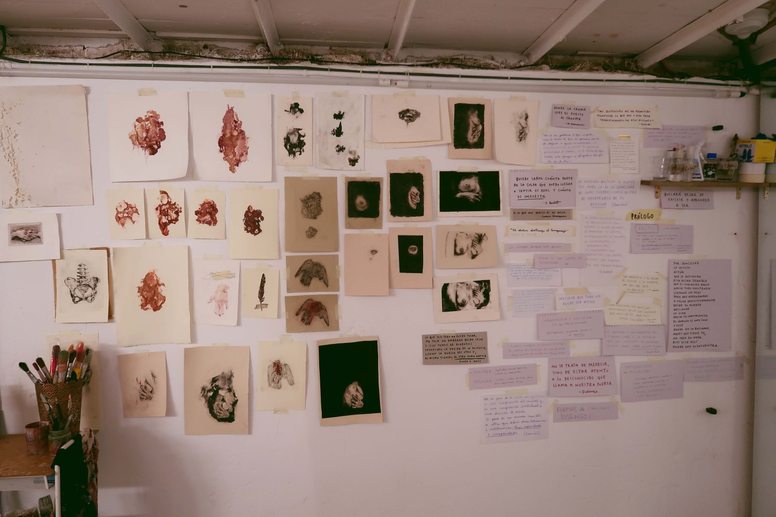 El camarero nos tomó nota. Déjame volver a empezar; el proyecto inicialmente pretendía ser una investigación sobre la enfermedad, podríamos decir que partía de una hipótesis. En el hacer, en el proceso, el que sería la fase de investigación y experimentación, me encontré con preguntas y respuestas naturales a otra cosa, a la propia práctica artística.