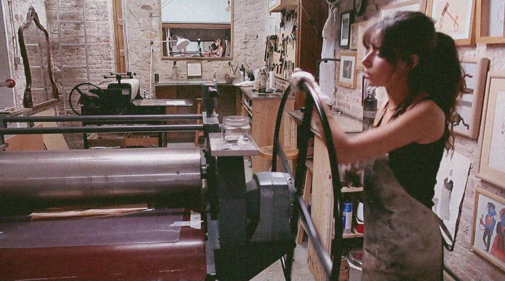 El grabado sobre cobre permite trabajar la misma imagen innumerables veces, y en cada una de estas estampas se vuelve a limpiar y entintar la plancha en su totalidad, por lo que, a pesar de provenir de la misma matriz, nunca hay dos estampas iguales. Esta irregularidad no es nímia, pues contiene la potencialidad de establecer un diálogo con la imagen, de trabajarla en diferentes colores, luces y cantidades para explorar todas sus vertientes: te permite viajar en la imagen para encontrarte de muchas maneras. El grabado te pide encontrar una mirada nueva en cada estampa y, en su devenir, te confronta con múltiples posiciones.