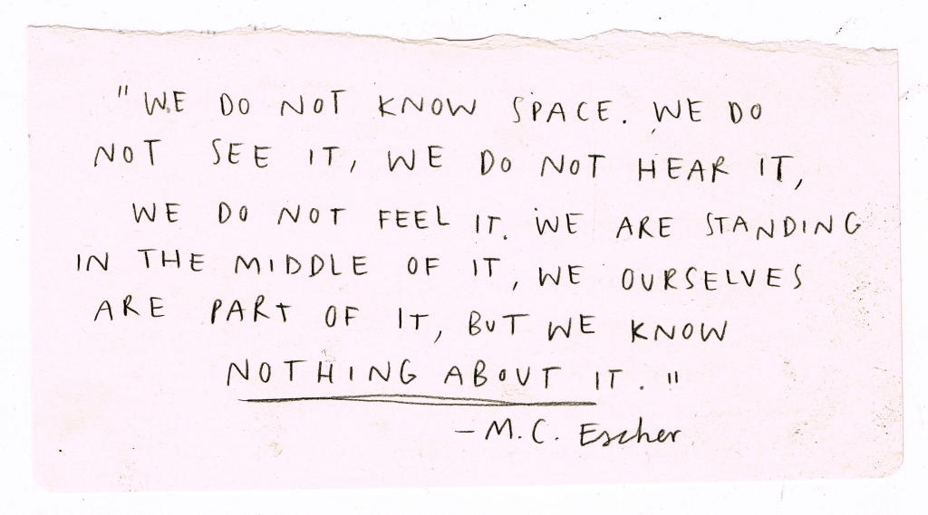 No debe de ser casualidad, pero, que Escher encontrará dificultad en definirse como artista. Los grabados de Escher son la muestra de una persecución de lo indeterminado, una obsesión científicamente minuciosa en desentrañar las lógicas de lo que damos por sentado. En el mundo de Escher, los pájaros son peces, los techos, suelos y viceversa. Por eso el grabado de Escher es un mundo para la posibilidad y el encuentro.