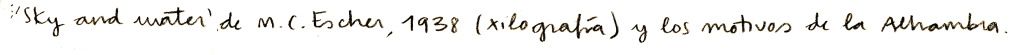 El domingo, pasados los nervios de la inauguración, visitamos la Alhambra. Hacía poco había estado leyendo la biografía de M.C Escher, en la que aprendí que había estado tres días encerrado en el recinto, copiando los motivos de los celosías y las cenefas del alicatado. Yo me moría de ganas de ver y conocer los paisajes que habían llevado a Escher a preguntarse por la infinitud, lo que hay constantemente más allá. Aquello que lo había llevado a grabar todo tipo de metamorfosis, de formas indeterminadas capturadas precisamente en su devenir, en el ‘tomar forma’: aquello de entremedio, la virtud. Creo que Escher es el grabador de las potencialidades.